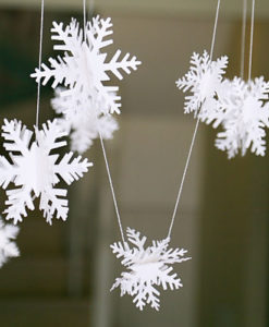 Vouw elke sneeuwvlok uit tot een soort 3d model en je hebt een bijna 3 meter lange slinger vol met witte papieren sneeuwvlokken . Een unieke decoratie voor bv de kerstdagen of etalage.