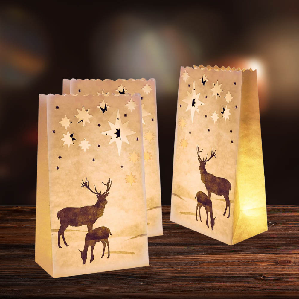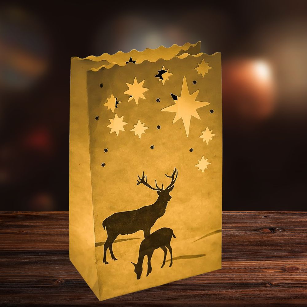 Breng de winter in huis met deze speciale candlebags met een print van 2 herten , en uitgestansde en geprinte sterren. Deze combinatie maakt deze candlebag een echte blikvanger overdag en in de avond wanneer deze verlicht is .
