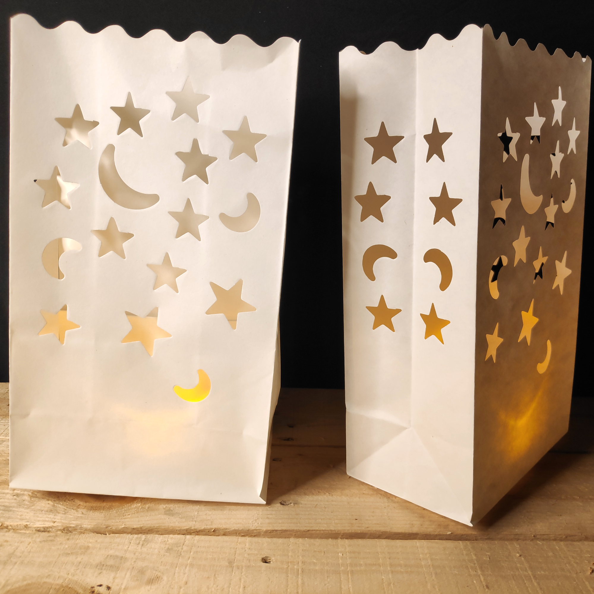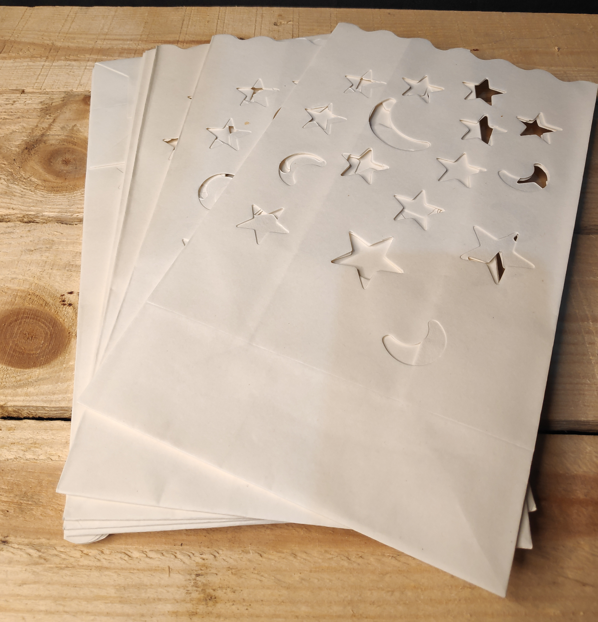 Deze nieuwe candlebag maan en sterren is een nieuw model dat wij aanbieden. Met dit tijdloze ontwerp is deze candle bag (kaarsenzak) het hele jaar door te gebruiken Maar zeker in de herfst en met de feestdagen is deze candlebag een sieraad in ieder interieur of buiten. Wanneer u een candlebag (kaarszak ) bij ons koopt zijn deze gemaakt van geïmpregneerd papier waardoor u deze candlebag veilig met een kaars of waxine kaarsje kunt gebruiken.