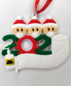 Op het ornament zie je een familie met mondkapjes op het jaartal 2021 met een covid-19 virusdeeltje een rol wc papier en een pompflesje desinfectiemiddel