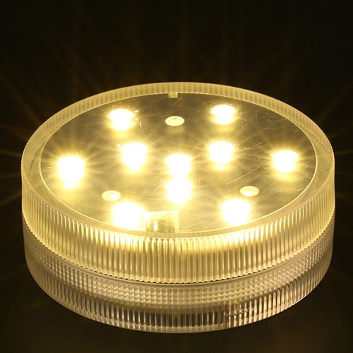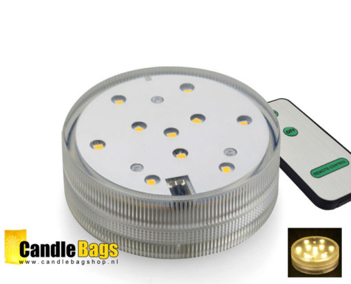 Deze LED lamp is waterdicht en heeft 10 warm witte SMD LED’s met een afstandsbediening. De LED base werkt op 3 AAA batterijen