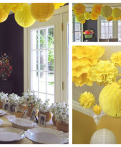 Pompons zijn decoraties gemaakt van zijdevloeipapier die lijken op bloembollen en vormen een prachtige decoratie. Wanneer u de pom pons combineert met lampionnen zult u zult versteld staan van het resultaat . Mix en match verschillende afmetingen en kleuren door elkaar en u creëert in een handomdraai de mooiste decoraties voor uw huwelijk, verjaardag- tuinfeest of andere feestelijke gebeurtenis.