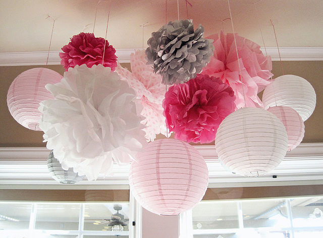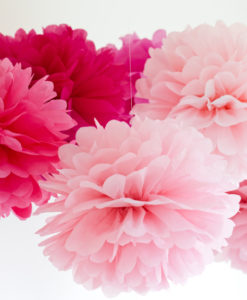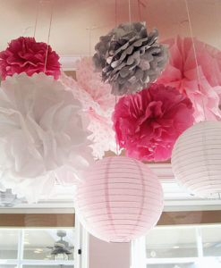 Pompons zijn decoraties gemaakt van zijdevloeipapier die lijken op bloembollen en vormen een prachtige decoratie. Wanneer u de pom pons combineert met lampionnen zult u zult versteld staan van het resultaat . Mix en match verschillende afmetingen en kleuren door elkaar en u creëert in een handomdraai de mooiste decoraties voor uw huwelijk, verjaardag- tuinfeest of andere feestelijke gebeurtenis.