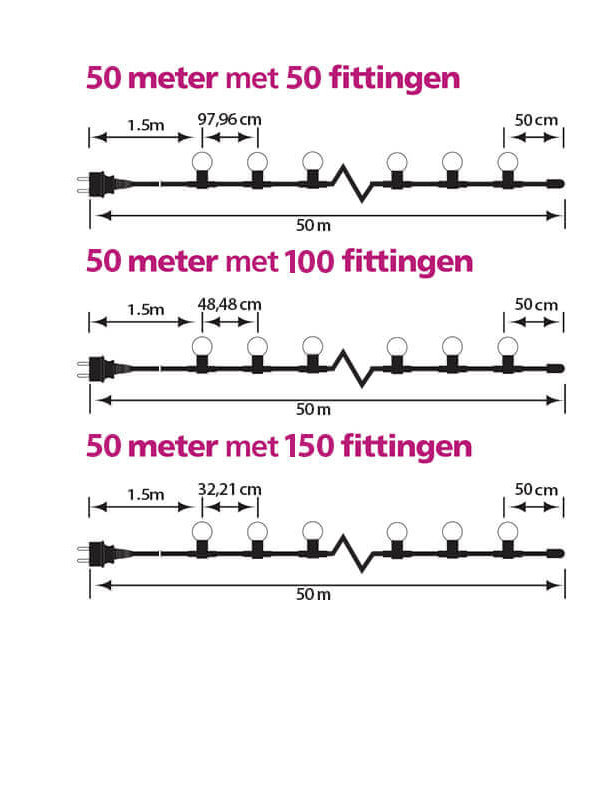 - 1 x Prikkabel van 50 meter inclusief lampen naar keuze ( zie boven) afdichtringen, stekker en eindstuk